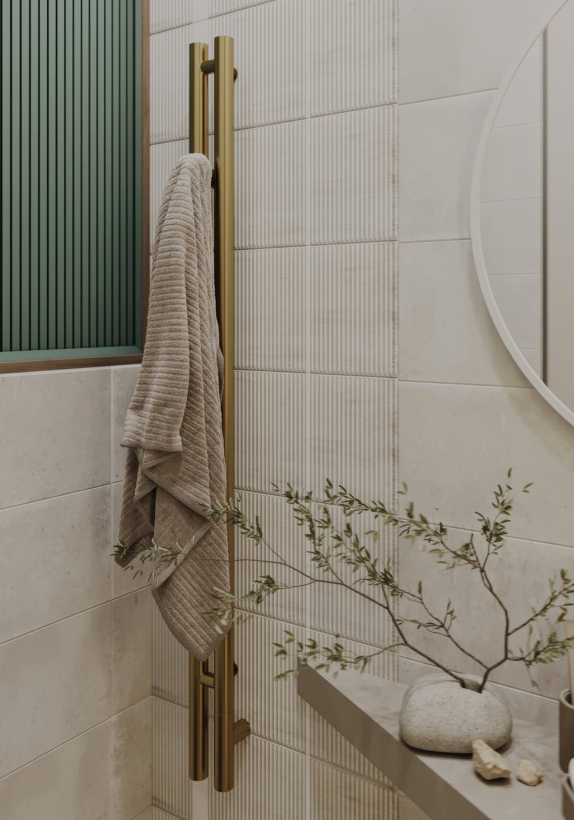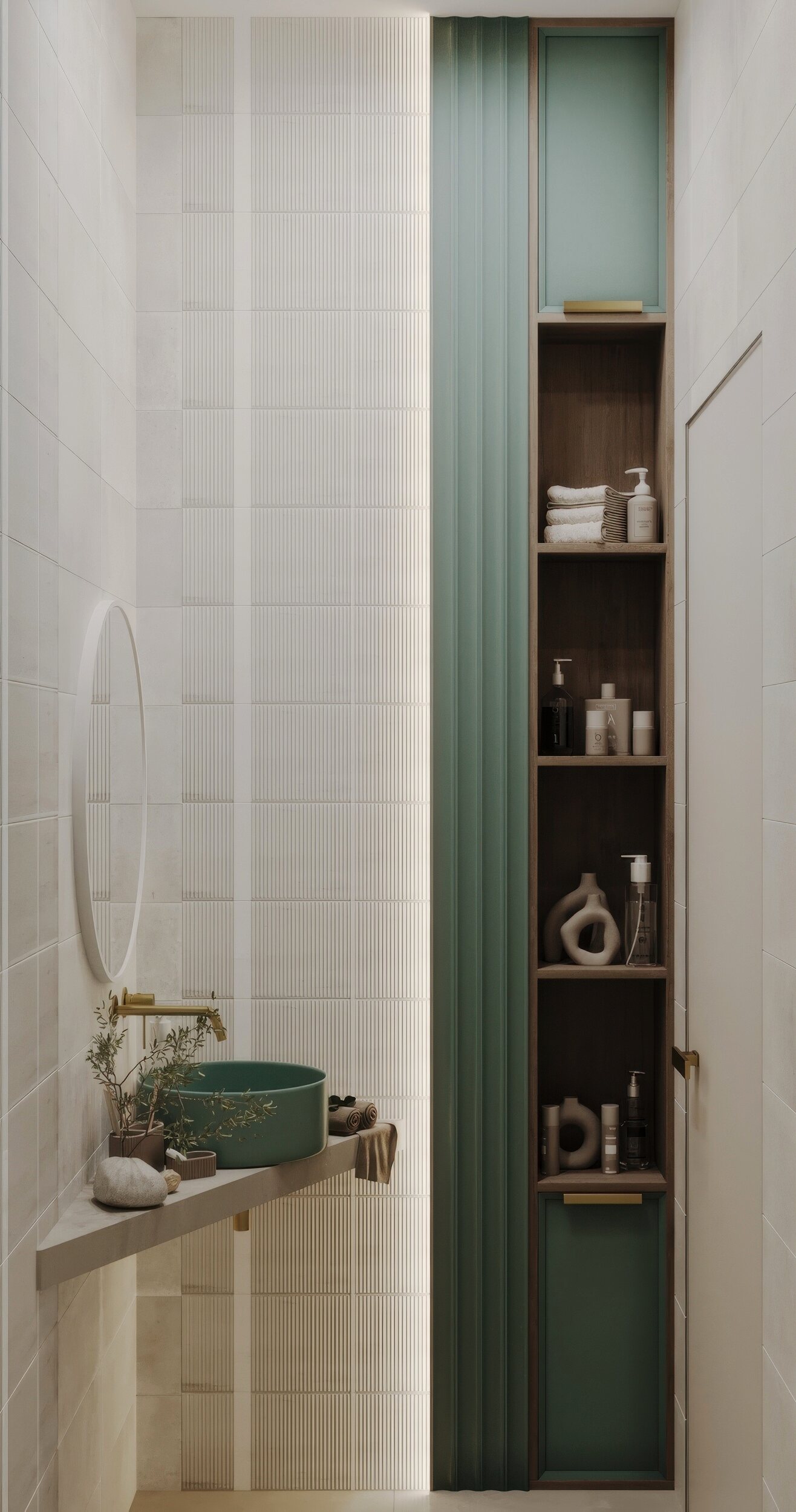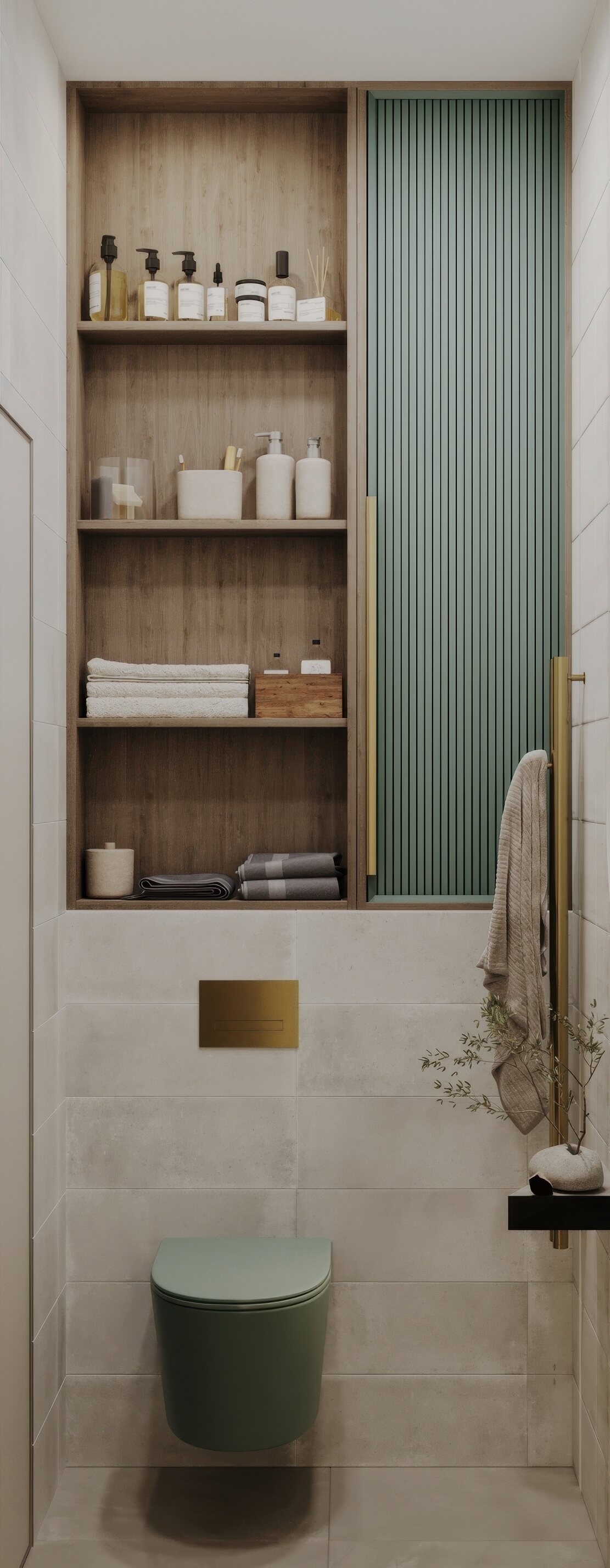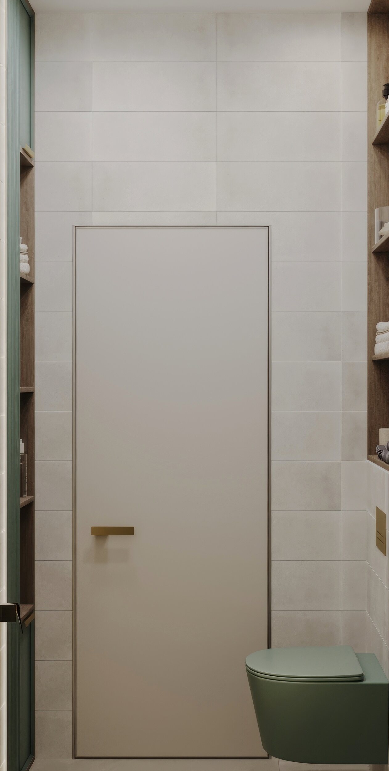 Функциональный санузел в трехкомнатной квартире ЖК «Сердце столицы», оформленный в стиле американской классики. Основной задачей было создать практичный и эстетичный интерьер, но без значительных затрат. В качестве ключевого акцента выбрана сантехника от Аквамира пастельного зеленого оттенка, который эффектно контрастирует с золотыми деталями: смесителем, кнопкой смыва и полотенцесушителем. Для оптимизации пространства спроектирована косая столешница, обеспечивающая удобное размещение сантехники и хранения. Компактный, но выразительный интерьер сочетает в себе продуманную эргономику и утонченную эстетику.